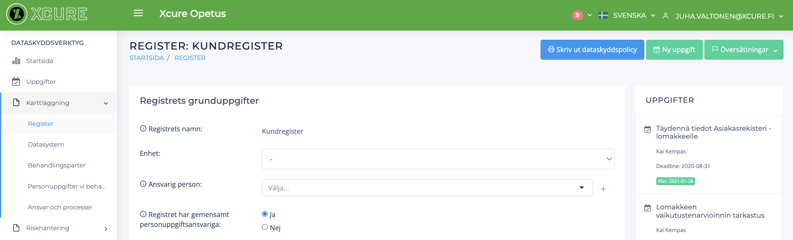 När du sparat information för första gången kommer du att se fler funktioner i det övre högra hörnet av formuläret, till exempel ”Skriv ut dataskyddspolicy”, ”Ny uppgift” och ”Översättningar”.