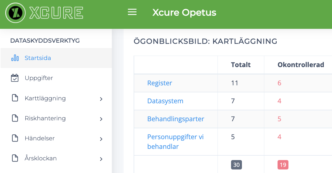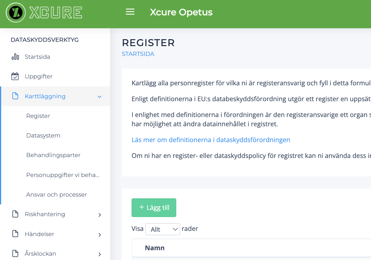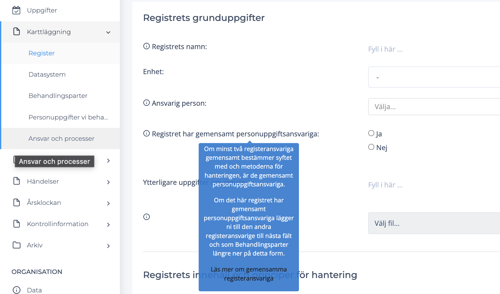 - Använd kartläggningsavsnittet för att kartlägga register, datasystem, personuppgiftsbiträden och register som ni är personuppgiftsbiträde för.