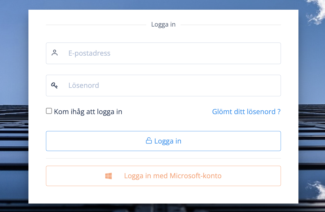 Du kan logga in på systemet med en klassisk kombination av användarnamn och lösenord eller med Microsoft-autentiseringsuppgifter. Microsoft-inloggning är organisationsspecifik och kan aktiveras av organisationens huvudanvändare från organisationens uppgifter.