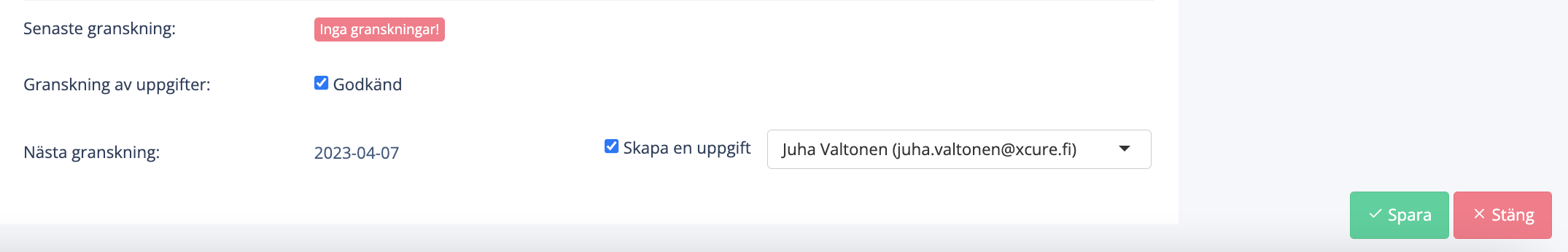 När uppgifterna i formuläret har fyllts i bör det granskas regelbundet i framtiden. Markera det ifyllda formuläret som granskat och välj en tid för nästa granskning. Om du vill få en e-postpåminnelse om granskning väljer du "Skapa uppgift".